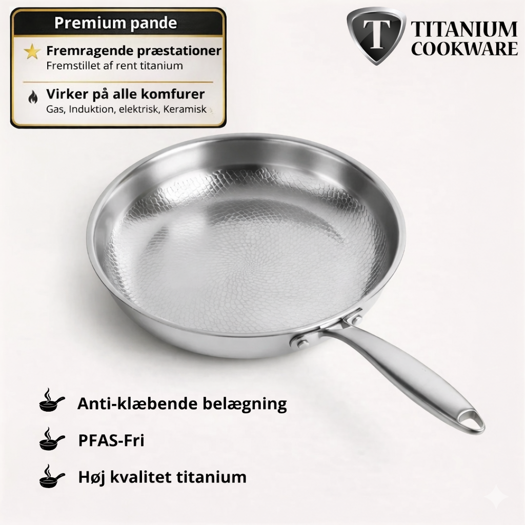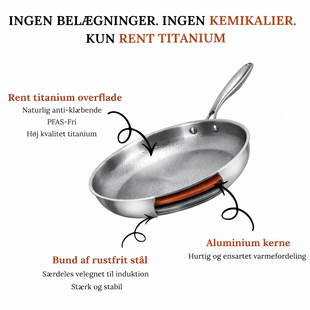 Titanium pande: ingen belægning, ingen risiko — 100% metal der er sikkert, stærkt og pålideligt.